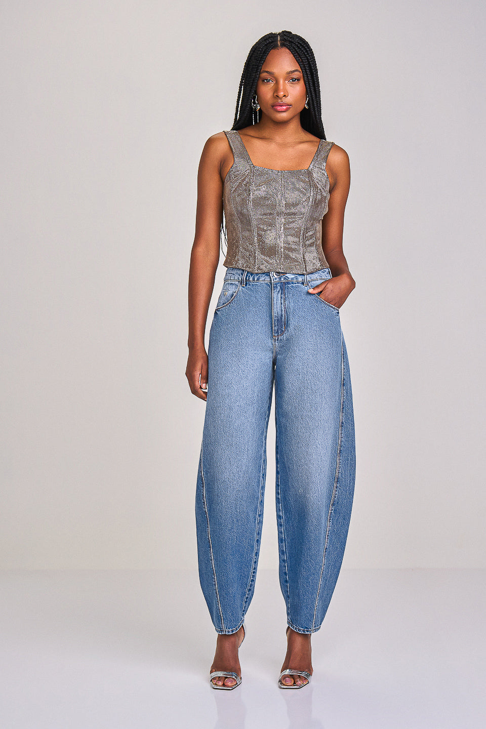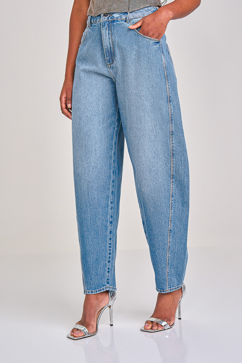 Calça jeans claro, possui cintura alta, caimento solto no quadril e pernas, afunilando até a barra, cinco bolsos, costura lateral deslocada, conhecida como modelagem Barrel. Confeccionada em sarja de algodão, garantindo estrutura e conforto a peça.
