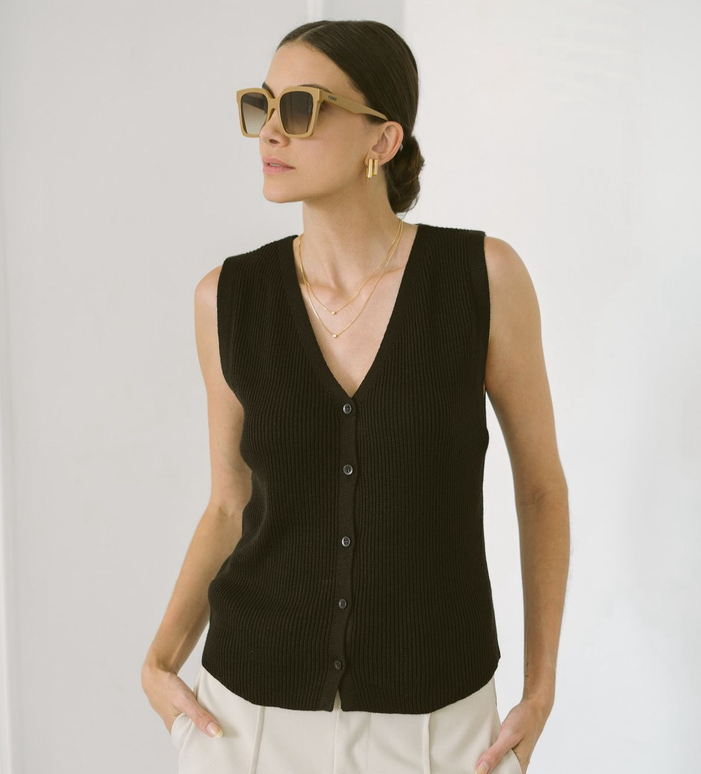 Descrição do produto: O colete Duda é confeccionado em tricot. Possui modelagem regata, decote V , botões frontal e caimento reto. Faça sobreposições com blusas de manga