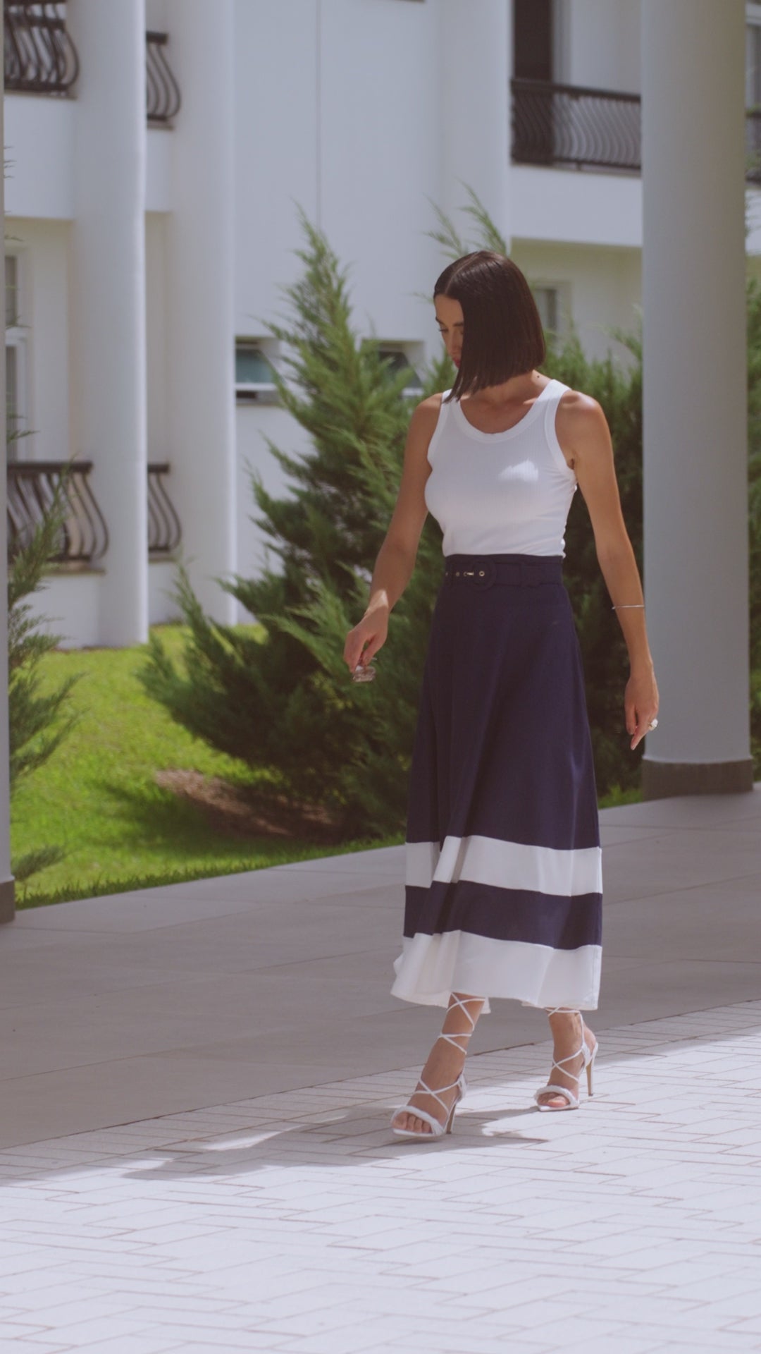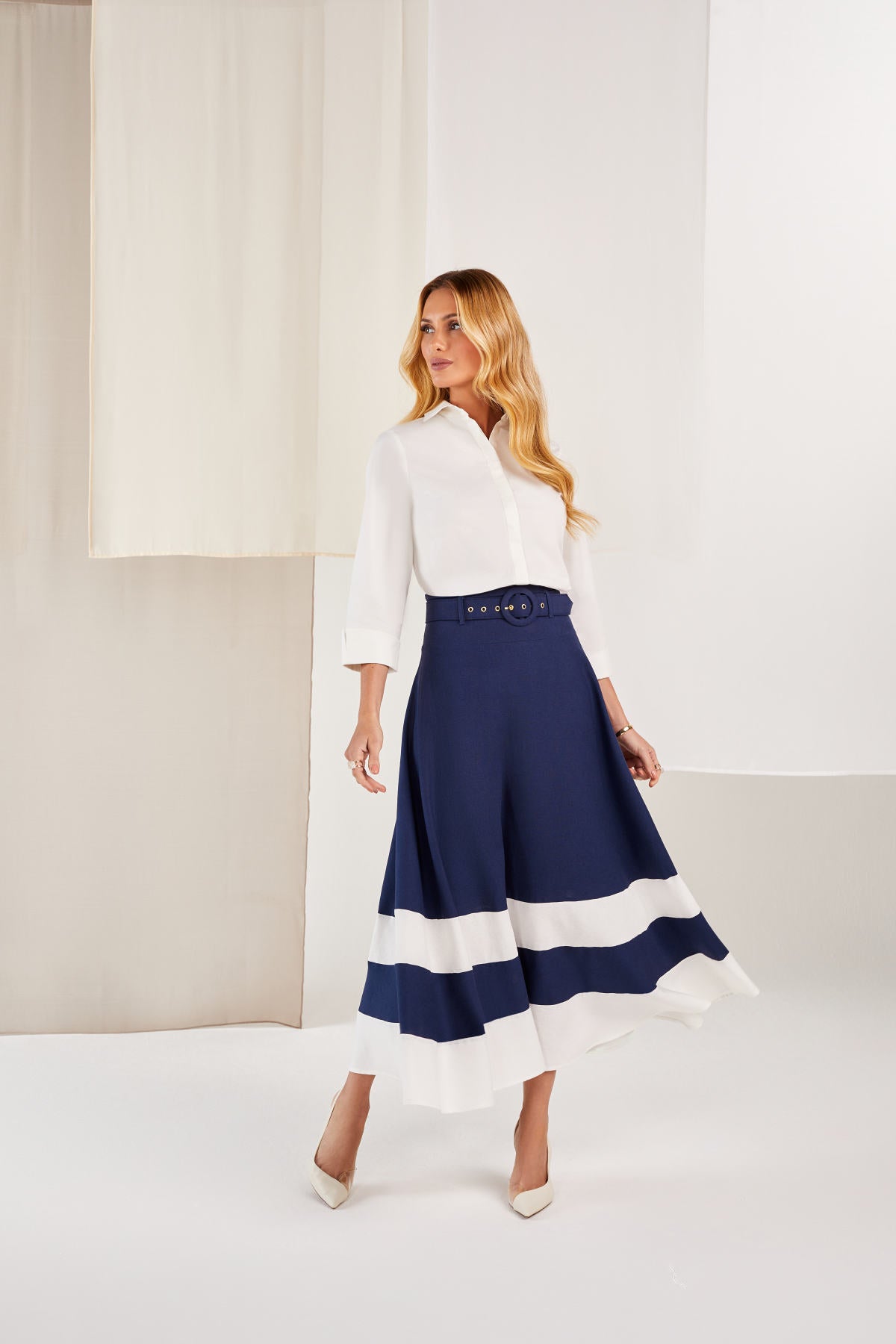 O destaque da saia fica por conta do cinto, que é confeccionado no mesmo tecido da saia, criando um visual harmônico e elegante, além de valorizar a silhueta. A barra bicolor, com duas faixas brancas contrastando com o azul marinho, dá um toque moderno e arrojado, trazendo sofisticação a um modelo clássico.