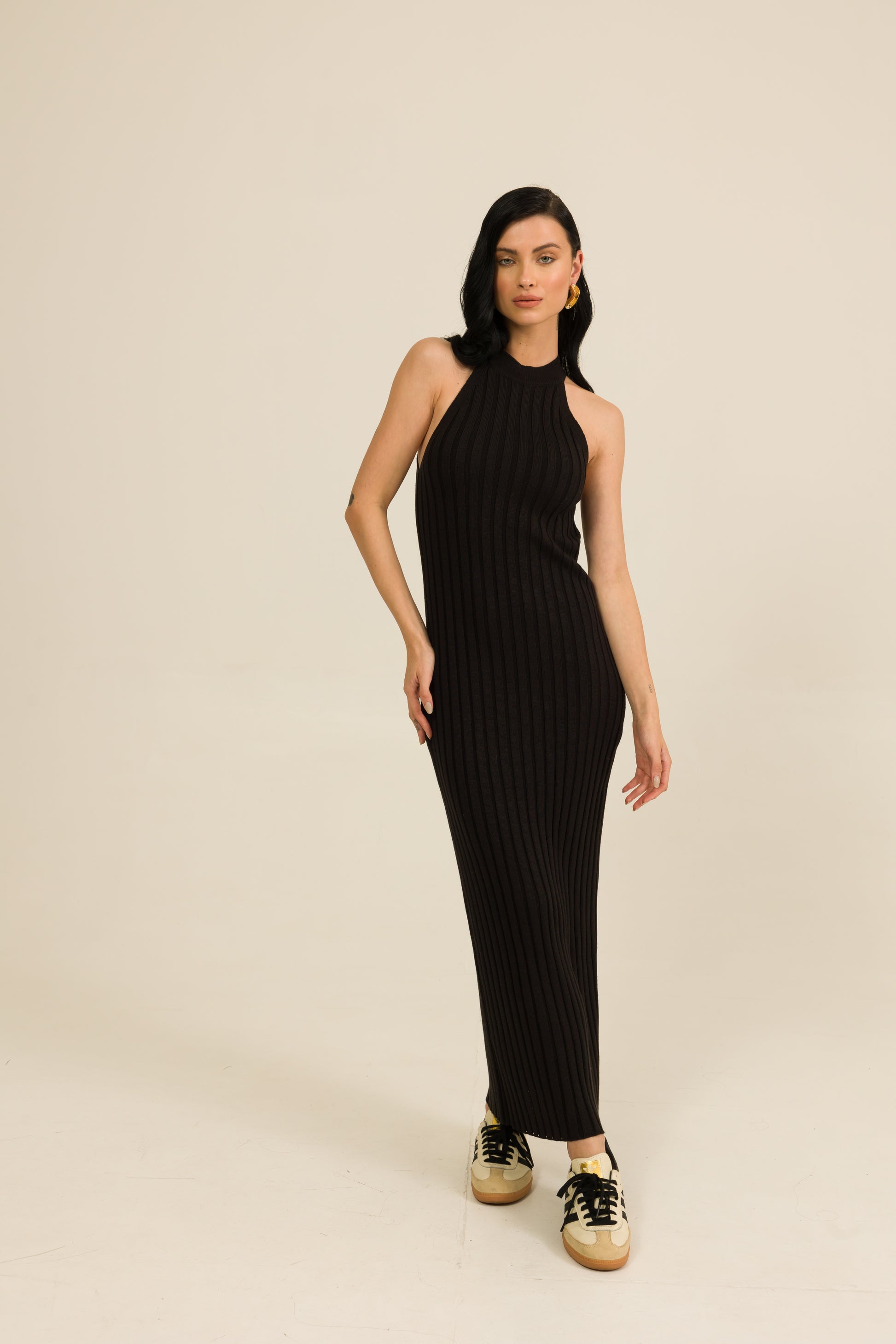 Vestido Katia possui uma gola halter, uma tendência dos anos 90 que voltou com tudo. É similar à frente única, com as "alças" passando em volta do pescoço, com comprimento longo e da textura canelada.